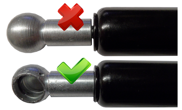 - Make sure that the gas spring is only loaded in the longitudinal direction. The gas spring may not be loaded transversely. If you use a ball joint on one side of the gas spring, you can prevent this to a large extent. If you do not do this, make sure that the gas spring is properly aligned.